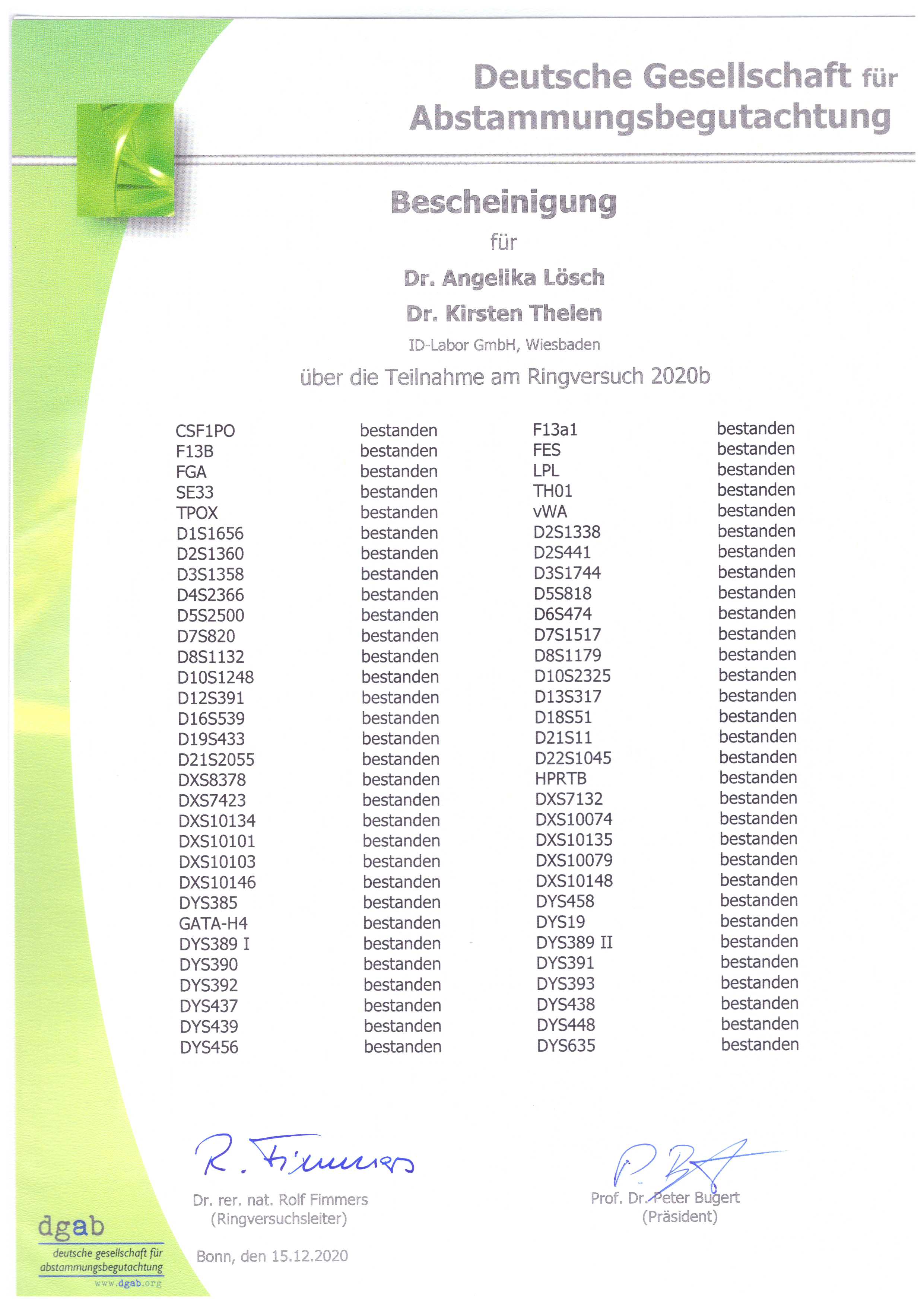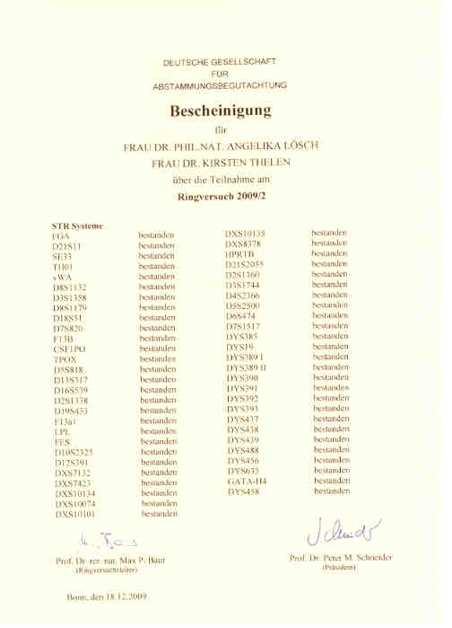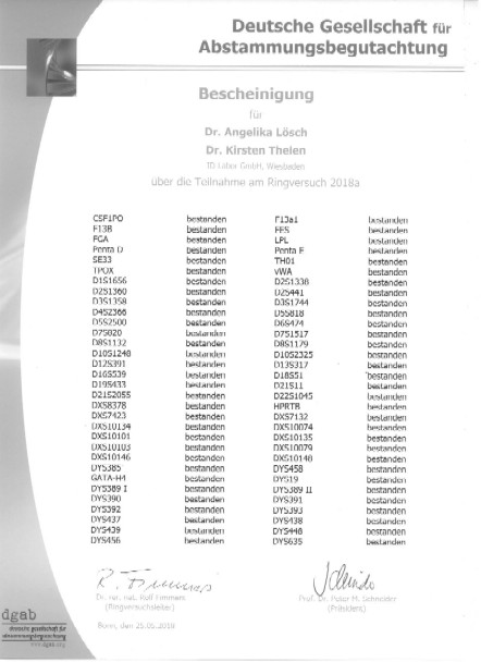 Nach den Vorgaben des Gendiagnostik-Gesetzes müssen seit dem 01.02.2011 Labore, die DNA-Analysen zum Zwecke der Abstammungsbegutachtung (z.B. für Vaterschaftstests) durchführen, nach der Norm ISO 17025 akkreditiert sein. Wir erfüllen diese Vorgabe und sind ein durch die DAkkS nach DIN EN ISO/IEC 17025:2018 akkreditiertes Prüflaboratorium. Die Akkreditierung gilt für die in der Urkunde aufgeführten Prüfverfahren.