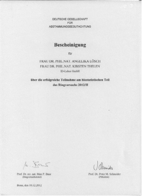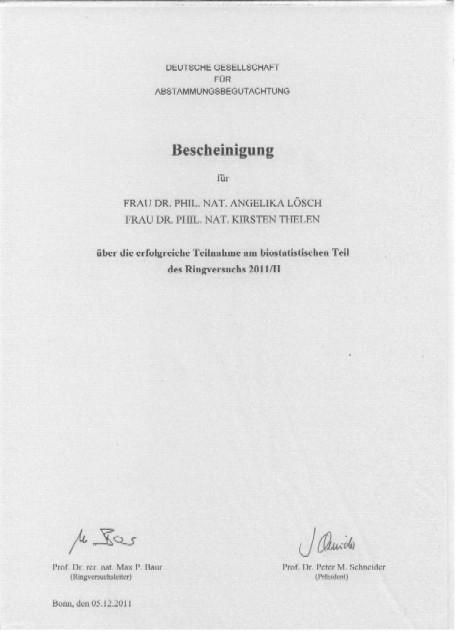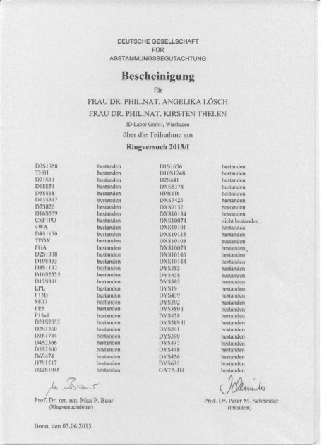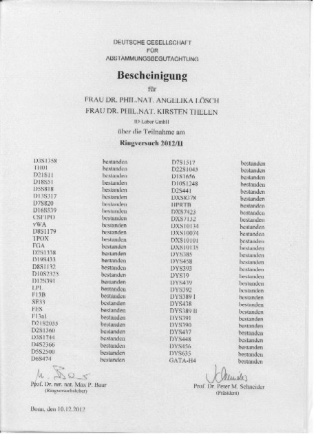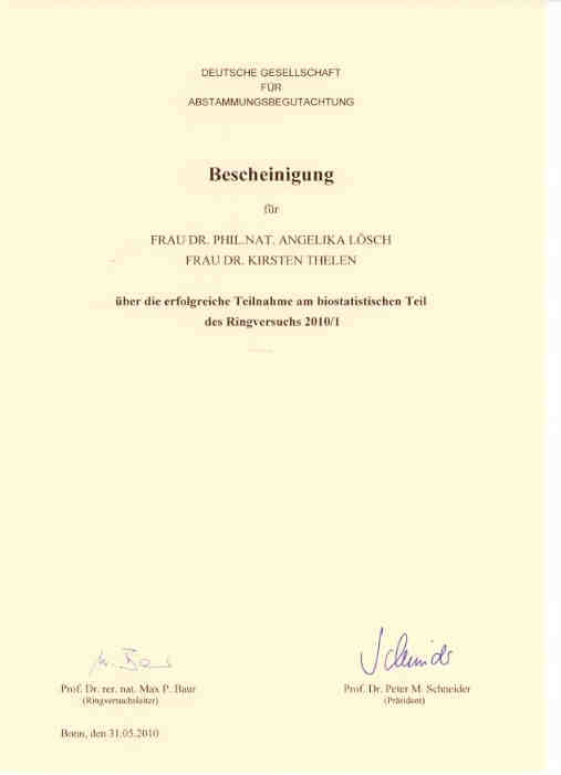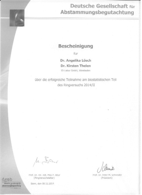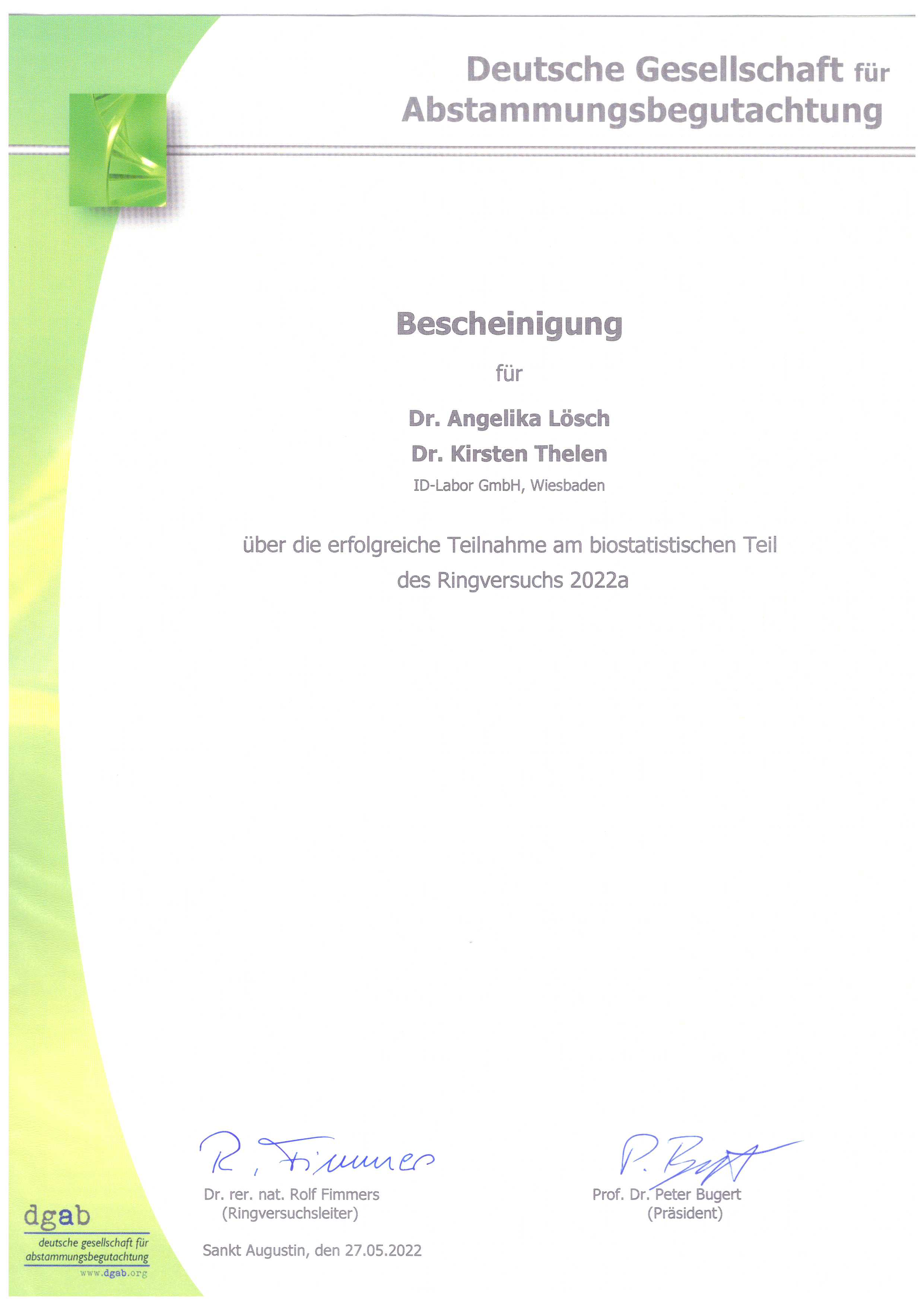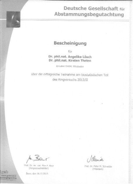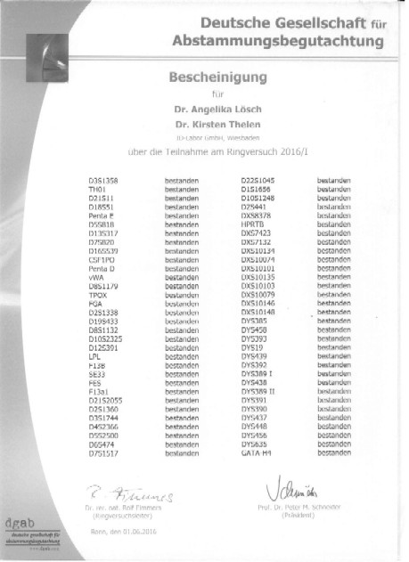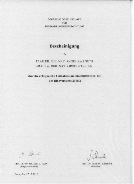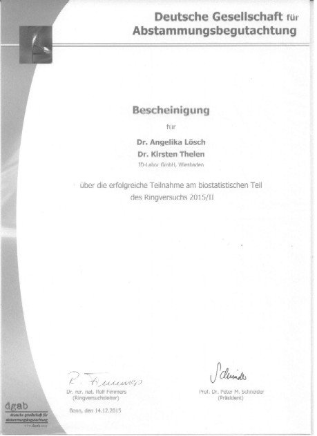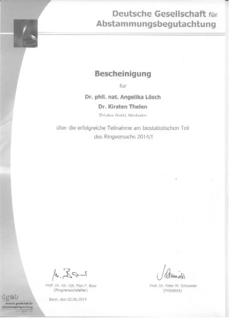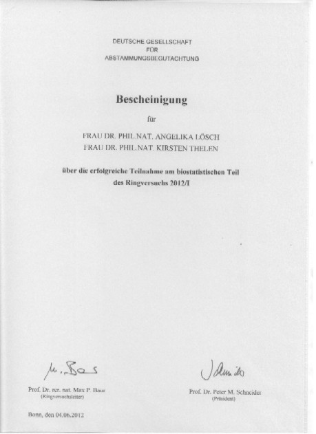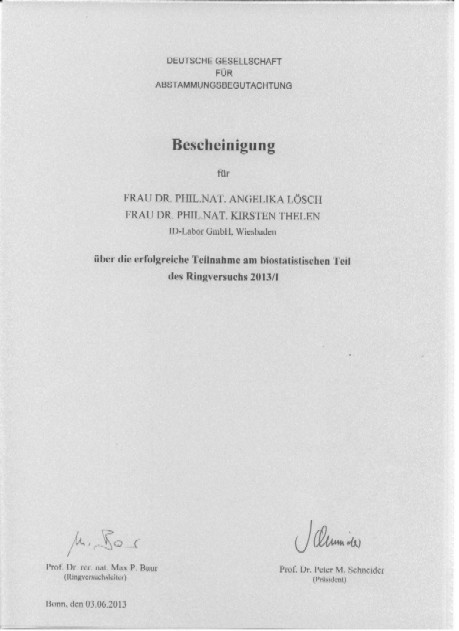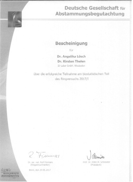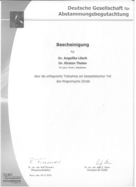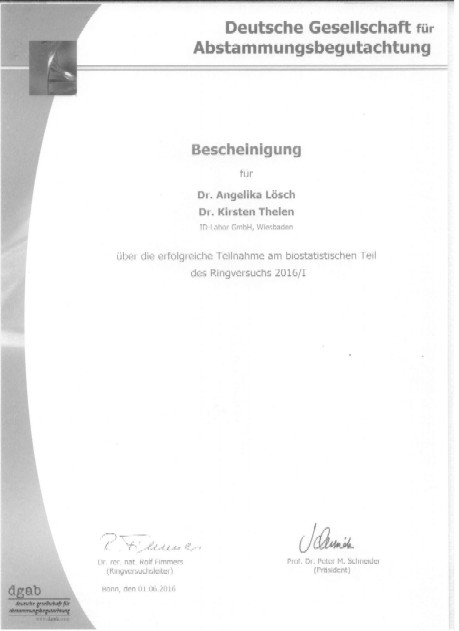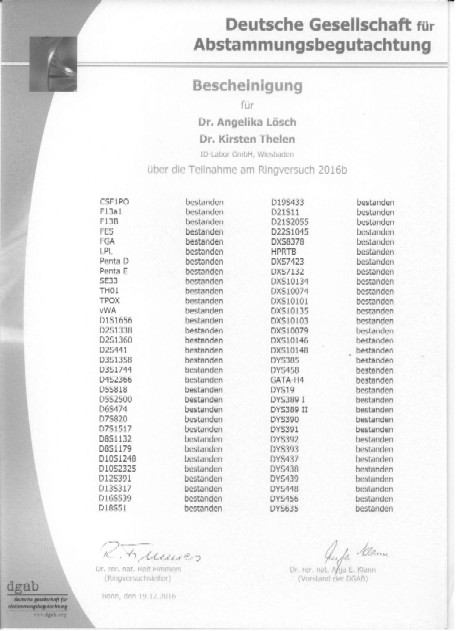 Mit Wirkung vom 09. Mai 2017 sind Frau Dr. Angelika Lösch und Frau Dr. Kirsten Thelen von der IHK Wiesbaden zu öffentlich bestellten und vereidigten Sachverständigen für genetische Abstammungsbegutachtung ernannt worden. Das bedeutet, dass sie gegenüber einer öffentlich-rechtlichen Institution Ihre Vertrauenswürdigkeit, Unabhängigkeit, Objektivität und besondere Sachkunde nachgewiesen haben.