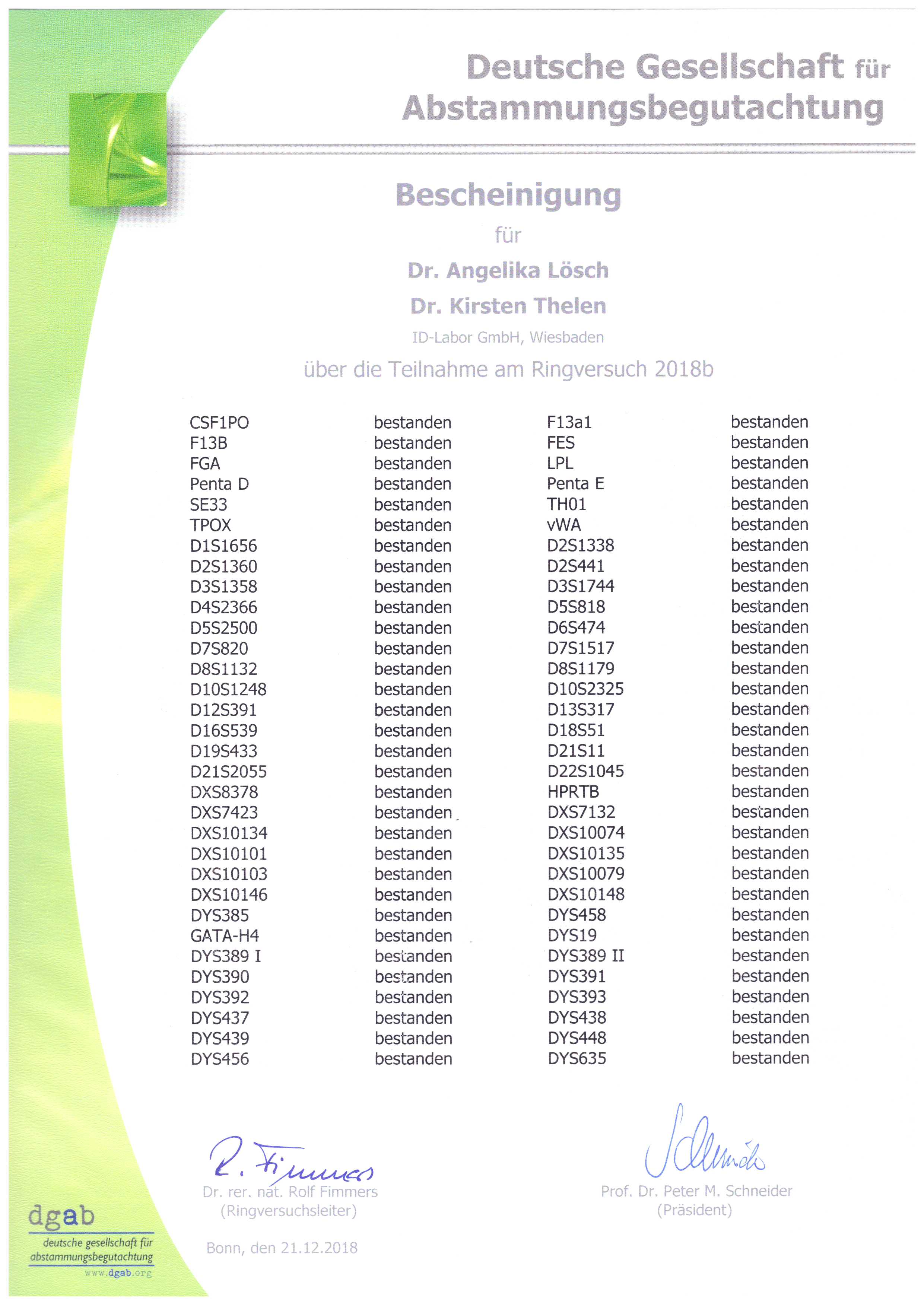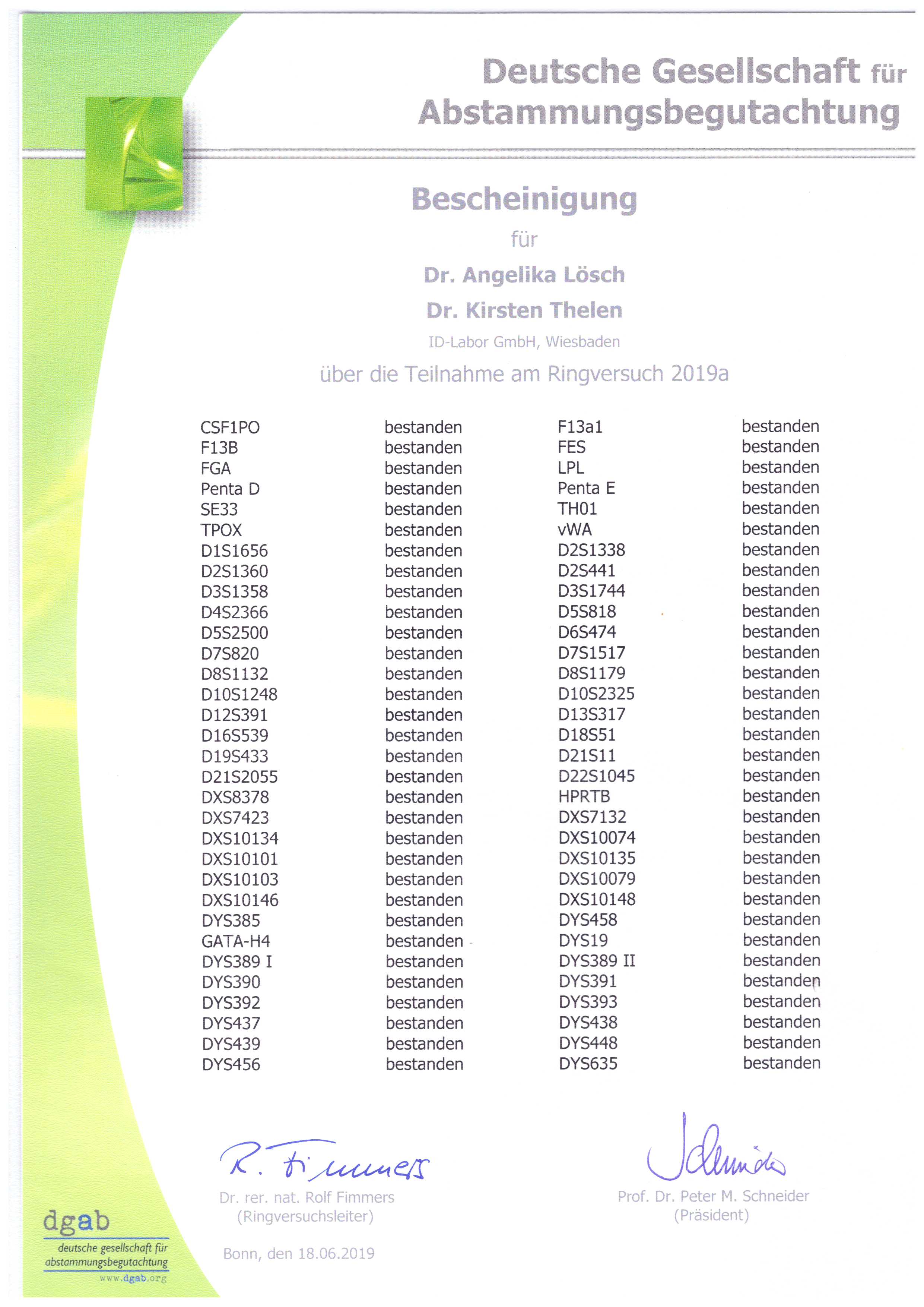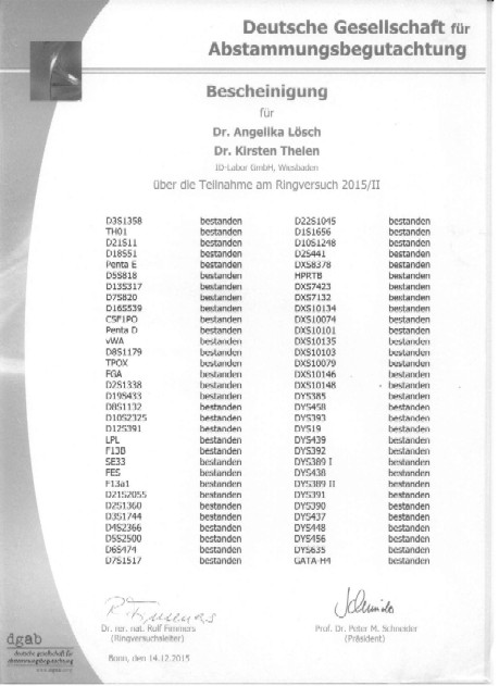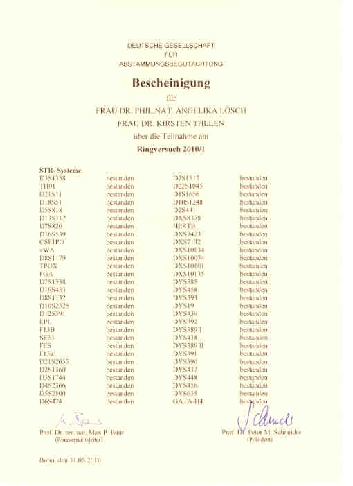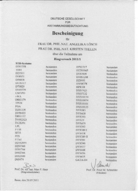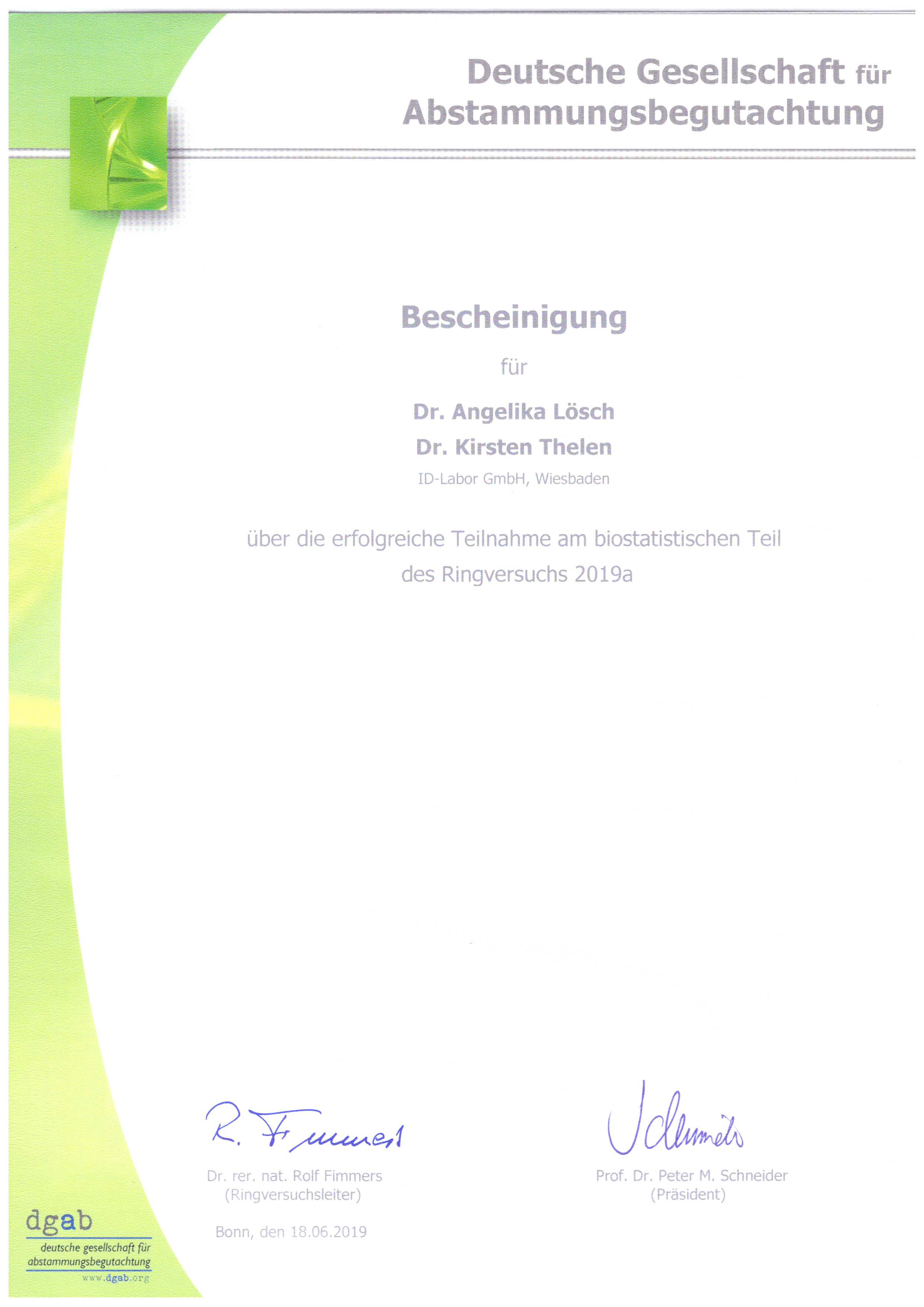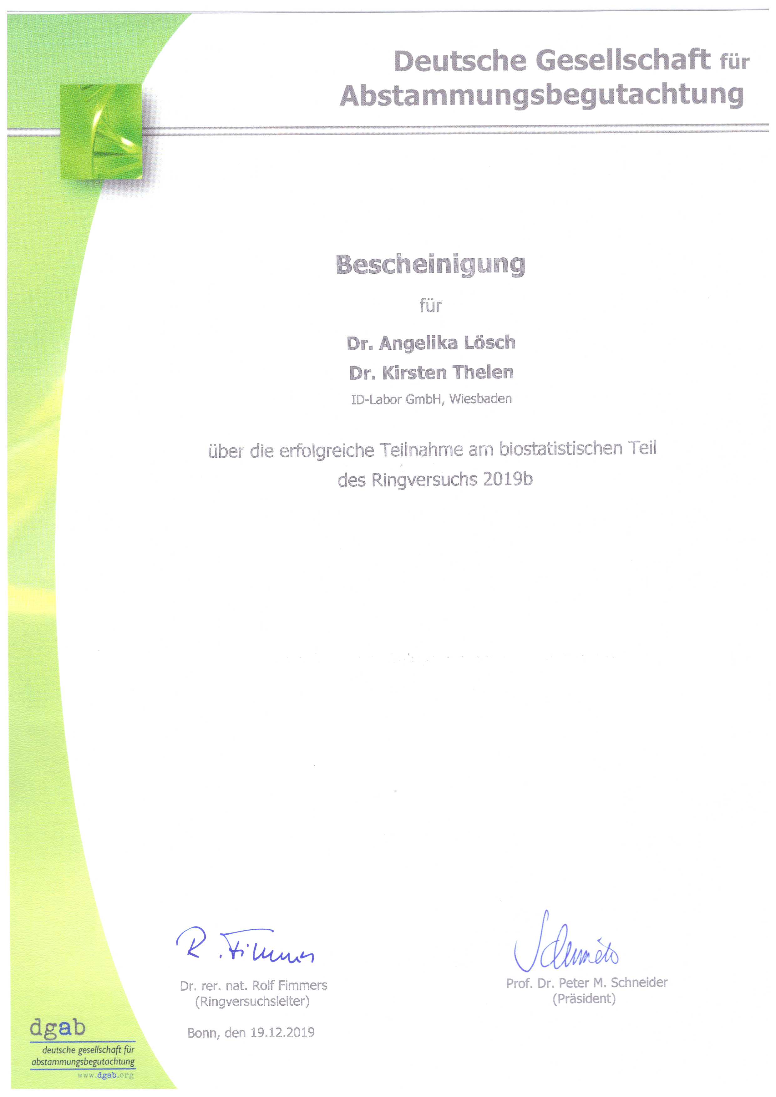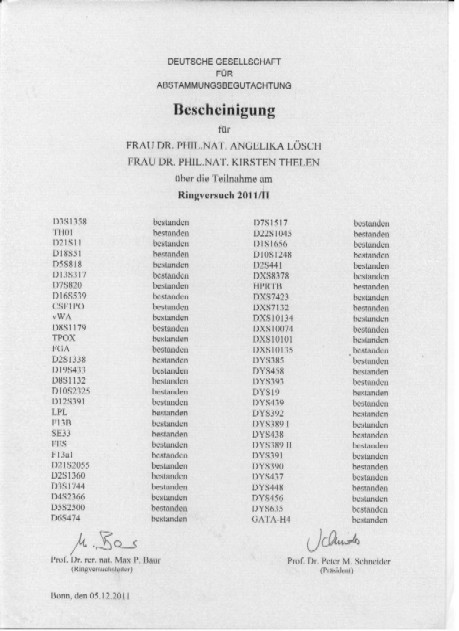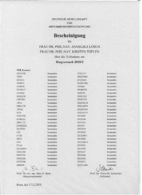 Mit Wirkung vom 09. Mai 2017 sind Frau Dr. Angelika Lösch und Frau Dr. Kirsten Thelen von der IHK Wiesbaden zu öffentlich bestellten und vereidigten Sachverständigen für genetische Abstammungsbegutachtung ernannt worden. Das bedeutet, dass sie gegenüber einer öffentlich-rechtlichen Institution Ihre Vertrauenswürdigkeit, Unabhängigkeit, Objektivität und besondere Sachkunde nachgewiesen haben.