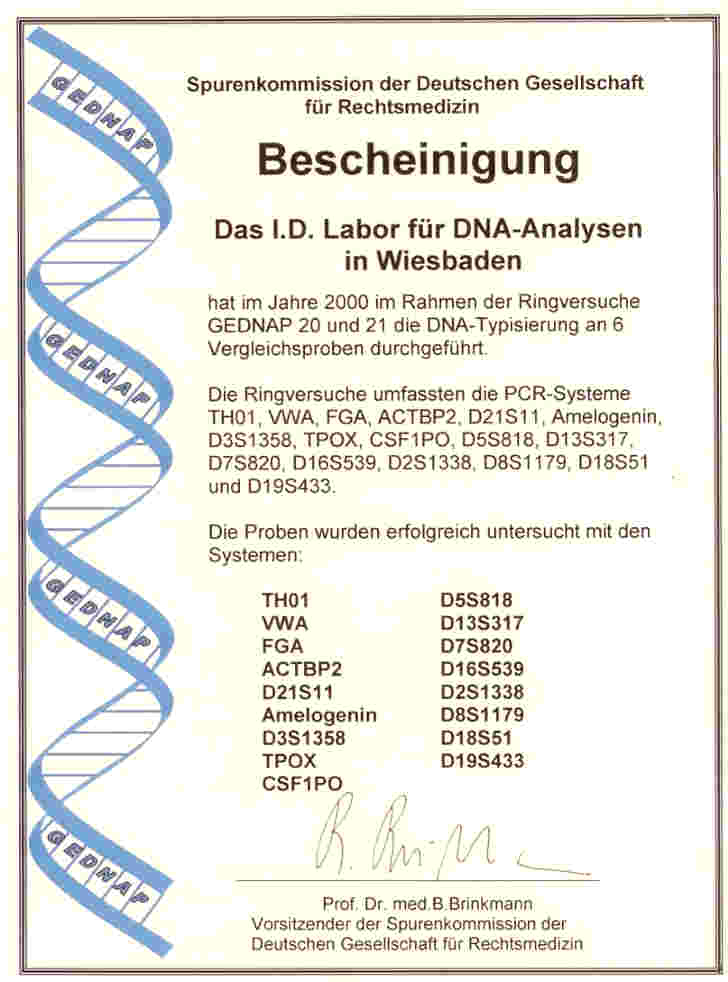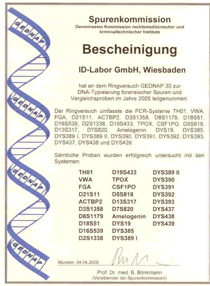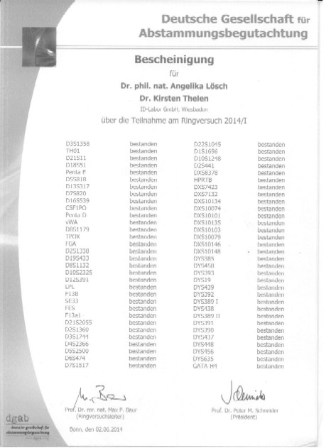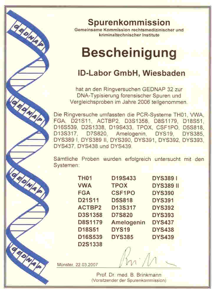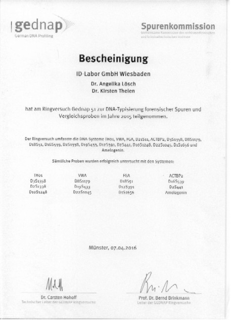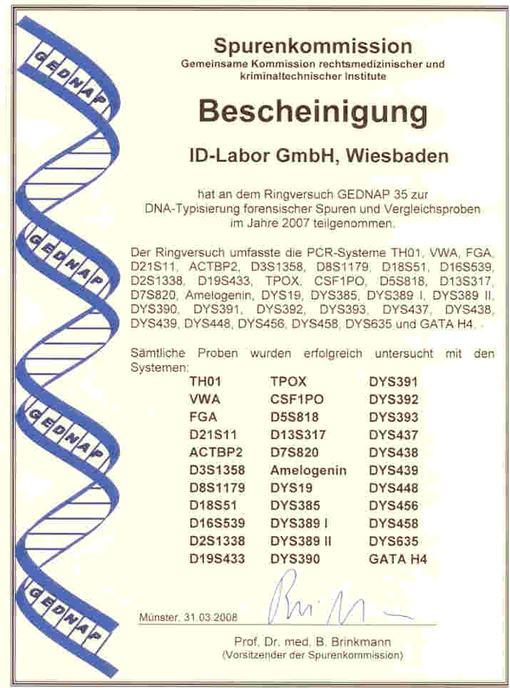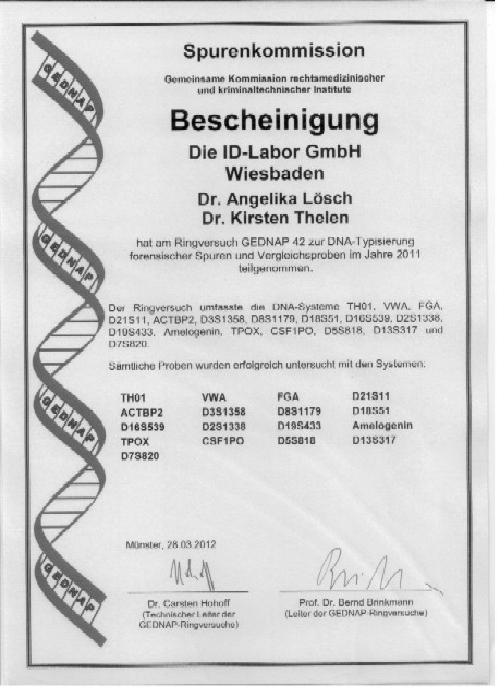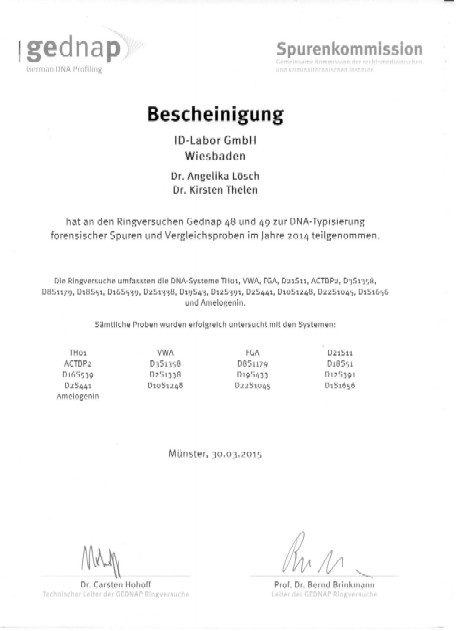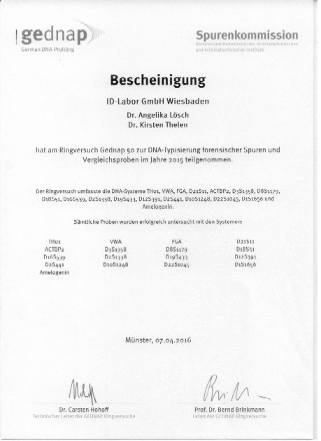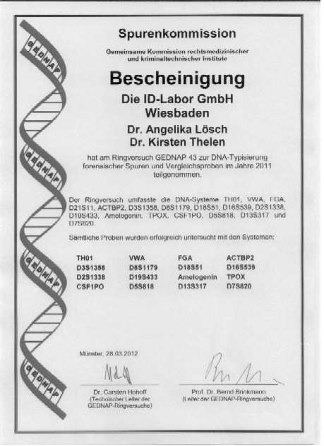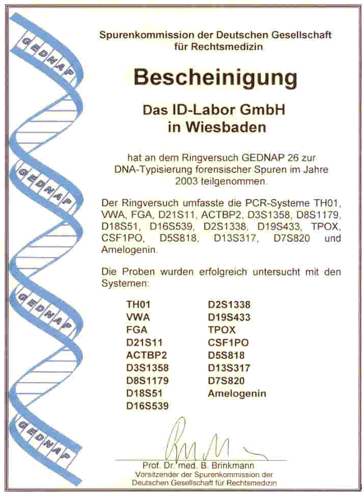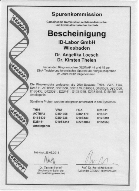 Gehe zu: Vereidigung durch die IHK Wiesbaden / Akkreditierung nach ISO 17025 / DGAB-Zertifikate / GEDNAP-Zertifikate